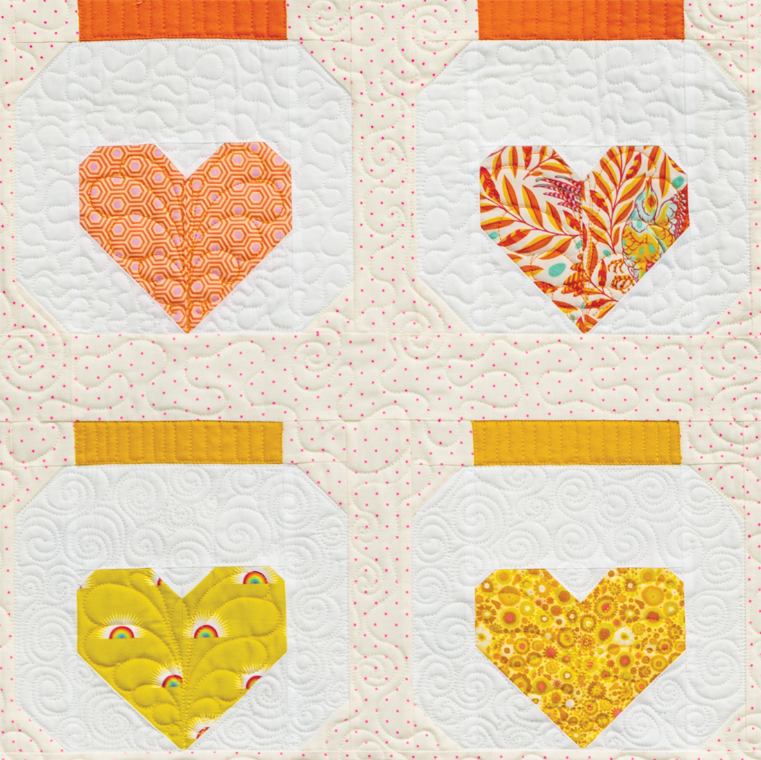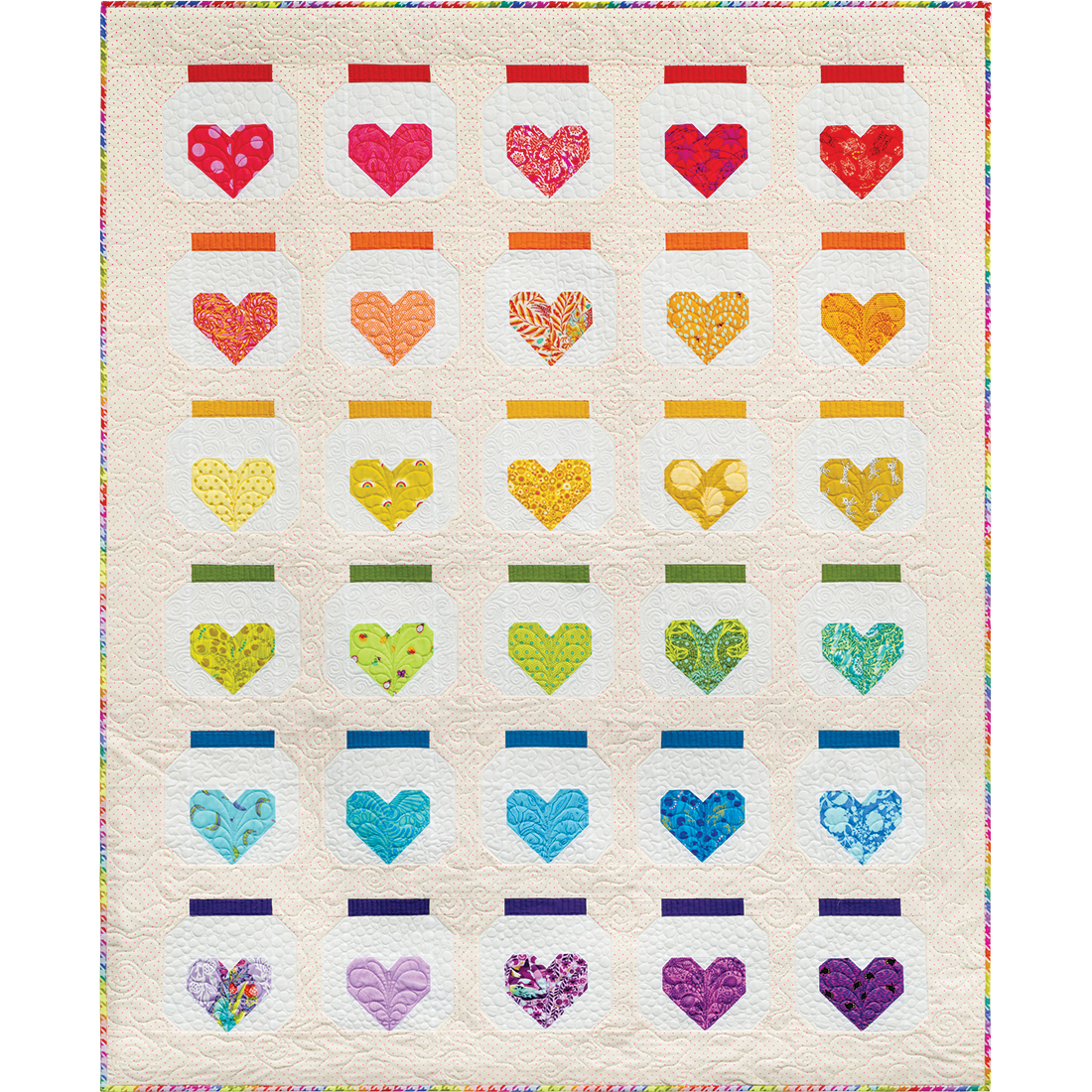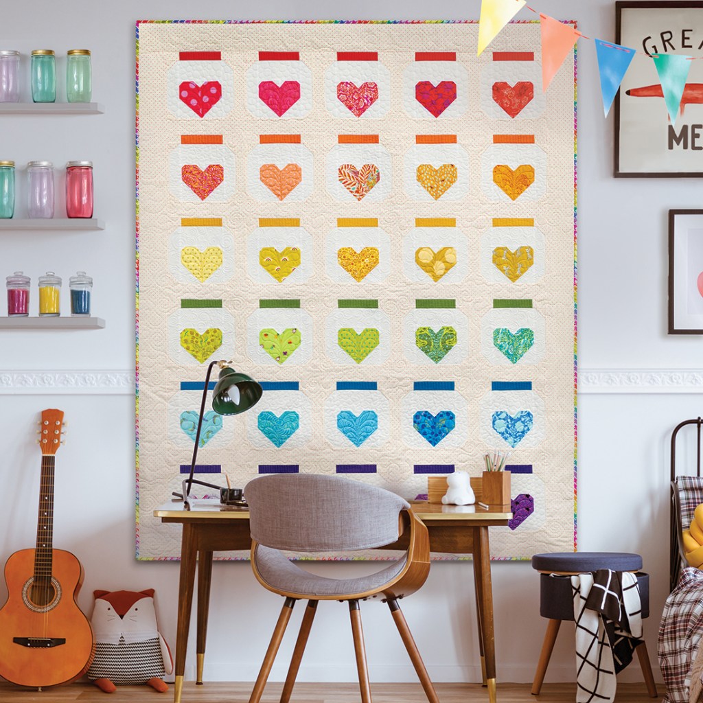 Jar of Hearts is bright, colorful, and full of my favorite fabrics from the past few years. Each jar block holds a memory perfectly preserved in fabric. This quilt is perfect for using scraps of your favorite fabrics. It finishes lap size, but can be resized quickly and easily by making more blocks.