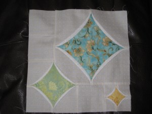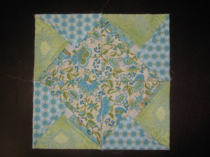 Sherbert at the Beach is my Michael Miller Cotton Couture Challenge quilt. I gets its name from a memory of the summer, when I took my little guy to the beach on a hot day. We had ice cream and it dripped all over the sand, too fast for us to catch it. It was a great day that I will always remember. When the challenge was announced at the August guild meeting the bright, citrus palette immediately brought the idea of bright fruity sherbert to mind and the memory of that day. Having only worked with Kona solids at that point, the Michael Miller Cotton Couture was a pleasant change for me. I like the texture and the weight of the fabric. It is almost a voile weight. Very light, easy to sew. I chose a Free Spirit Designer Solid in Sandstone as by background color to keep the colors popping without looking like a neon sign. I also used it for the backing and binding, and threw my extra blocks onto the back. WHAT?! A Pieced back you say! That’s right, I finally did it!