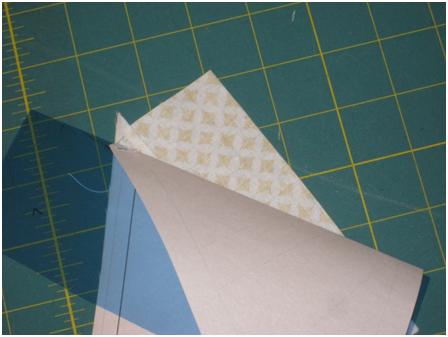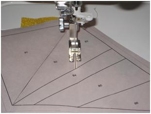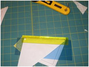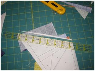 Take your 4 Templates without Corners and place strip #1 Right Side Up on the unprinted side of the template. Use the light trick to make sure the entire section is covered. Baste the strip in place on the dotted cutting line or in the extra paper outside the template. This will hold your fabric in place. Place your straight edge along the sewing line, turn the paper back, and trim the seam allowance. (It is the same line as shown above)