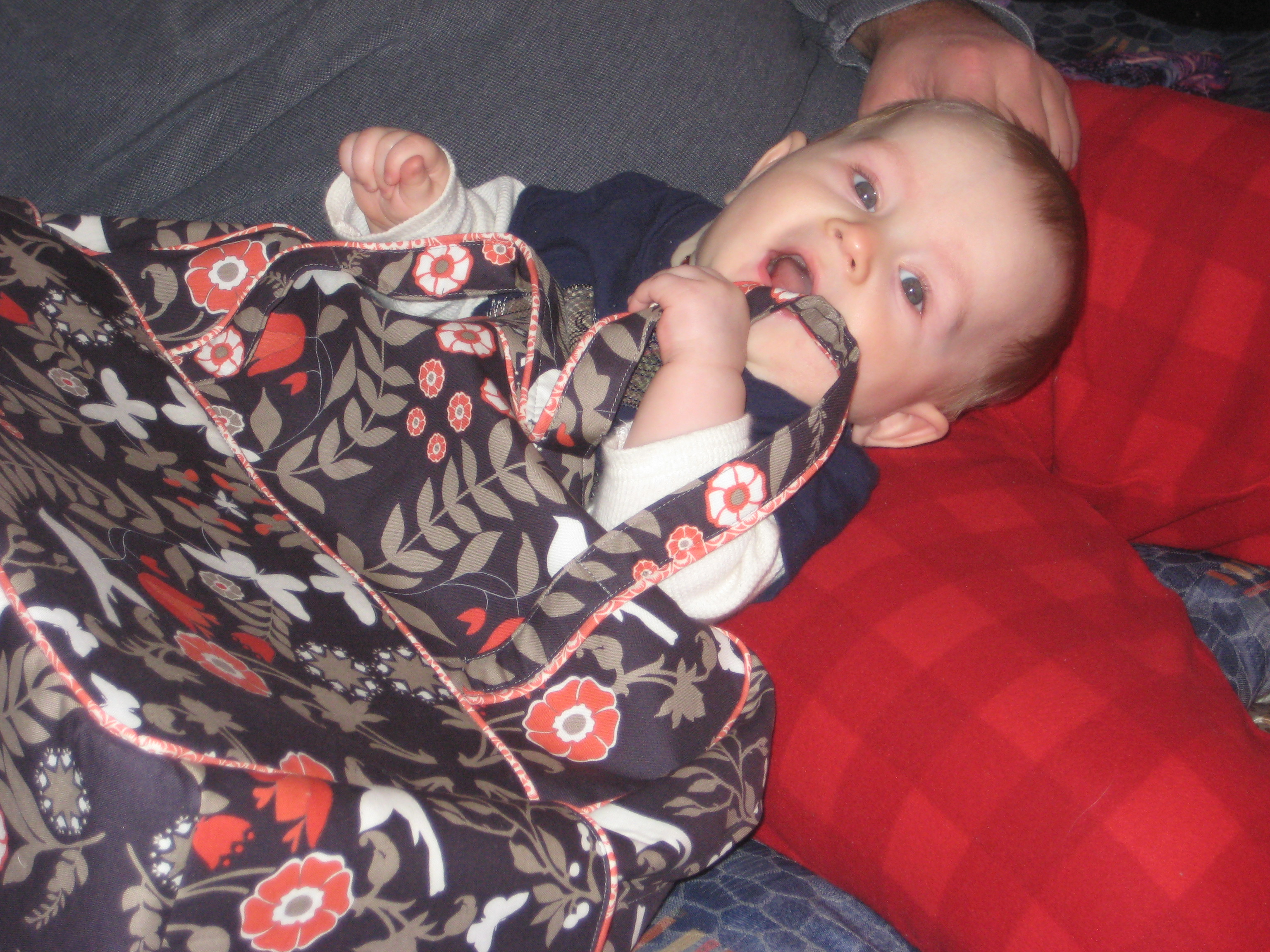 And not just this section, the whole darn length of the rail! What is he doing in there?? It really can’t taste good. Or be very good for his teeth, though I guess babies need to file those sharp little chompers on something other than Mommy’s hands, or the cat……