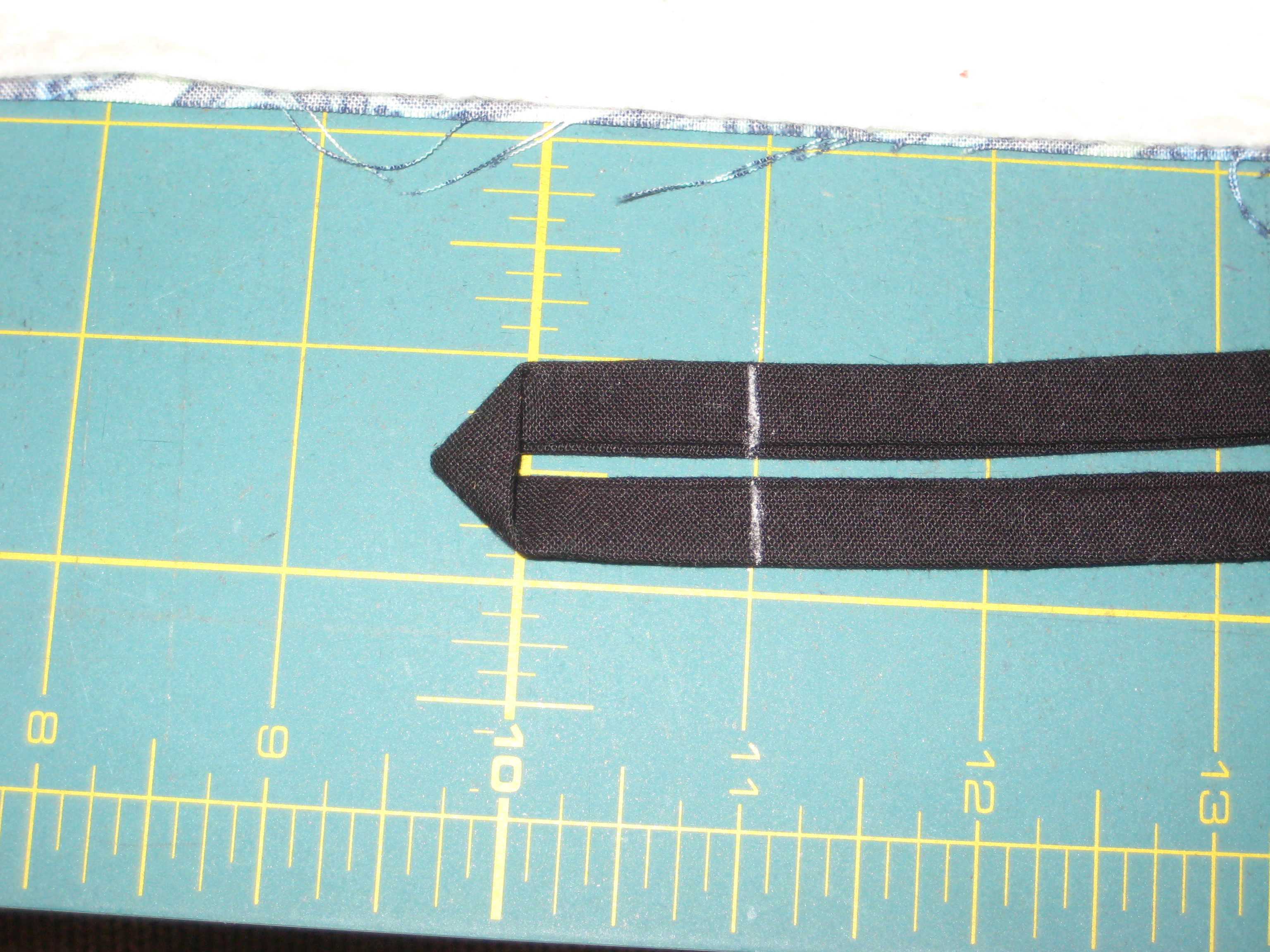 For store bought bias tape: edge stitch the tape closed across the entire length. Cut 4 strips 12″long and 2 strips 25″ long.
