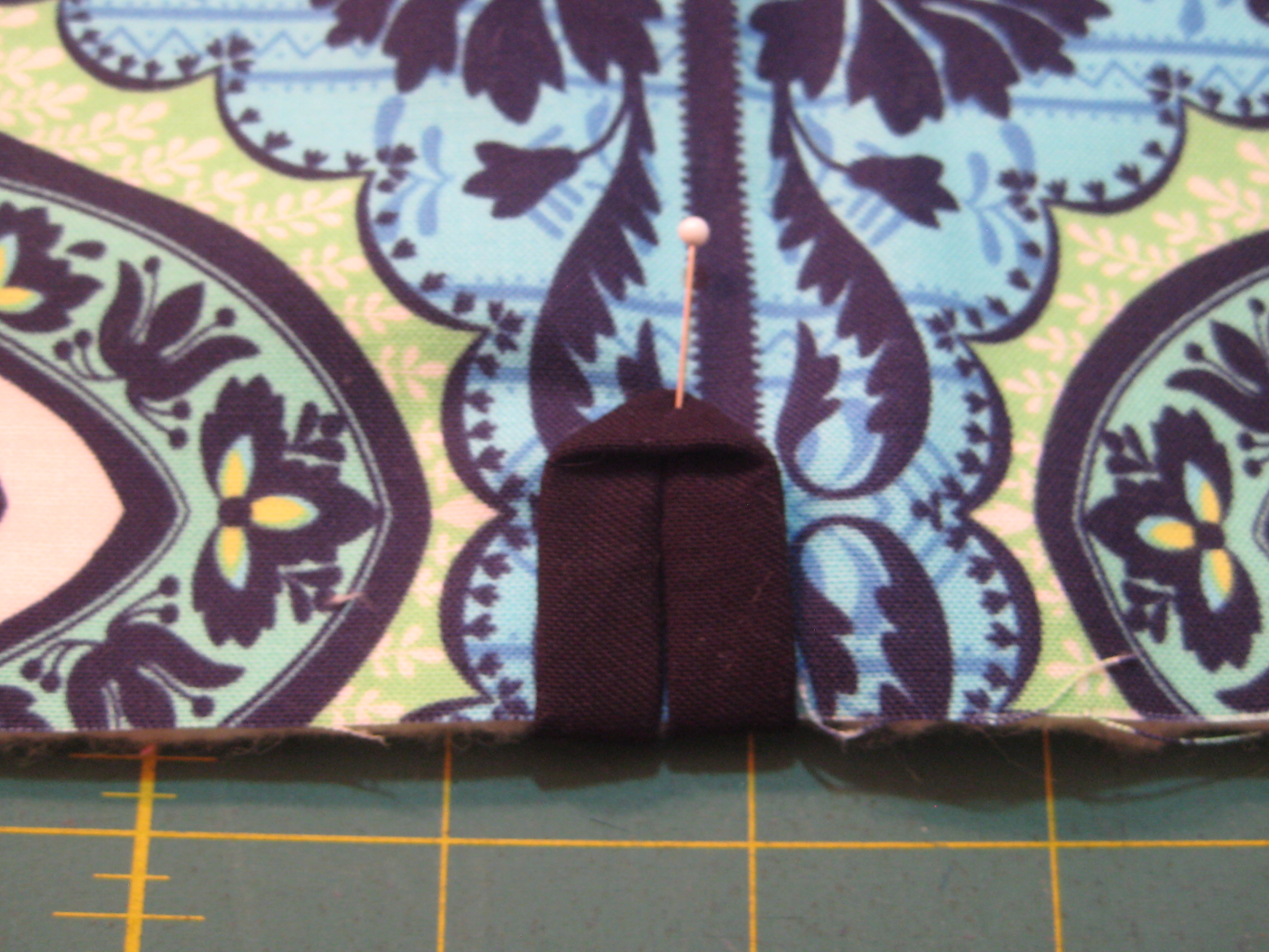 *Please note I sewed the seam and forgot to put in my end ties, so there are no pictures for this step. Just make sure the raw edge of the ties match the raw edge of the short end and the long tails are pinned to the center of the bottom panel to keep them out of your final seam.
