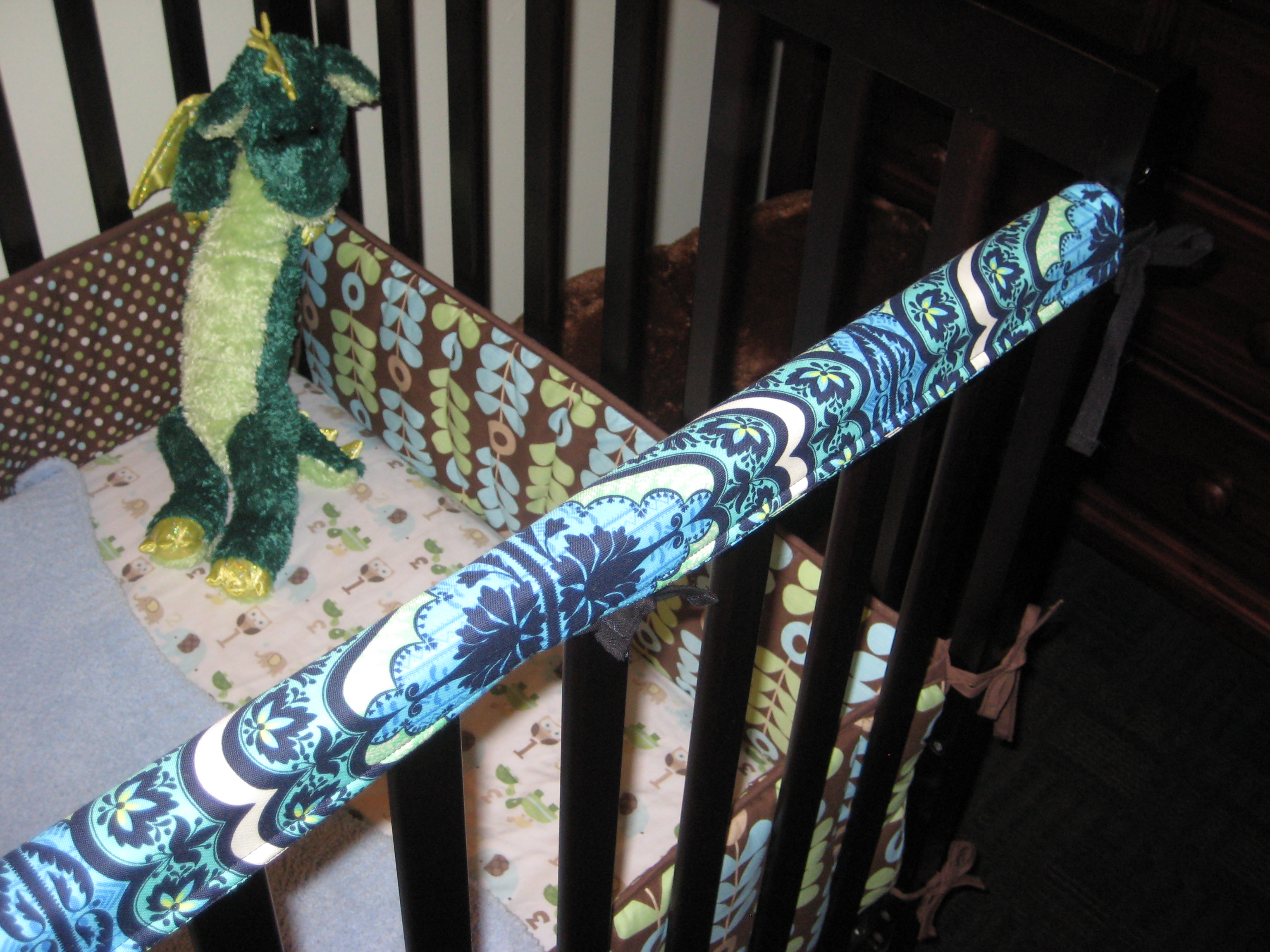 To attach, put the cover over the top of the rail so that the loops are to the inside of the crib and lines up with a vertical rail as best as possible. Take the tie tail and pass them through the loop under the horizontal rail (one on either side of a vertical rail if they lined up) then back around the vertical rail and tie. This secures everything. Then tie the ends to the edges of the crib. Again, I forgot to take pictures and I don’t dare while the little guy is sleeping, so you will now all be subjected to my talented Paint diagram. Yay me!