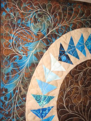 My quilt, Mariposa, is a super enlarged version of the Lillyella Stitchery “Take Wing” pattern. The original finishes at 18″x 24″, a perfect mini quilt size. My version finished at 35″x50″!
