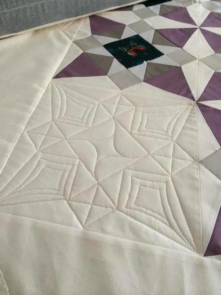 Then I took the quilt off to the long arm. I froze for a bit, I knew what I wanted in the wig sections, but the background had me stymied. After a quick consultation with the amazingly talented Mandy Liens I outlined the butterfly and then used my favorite background filler from Christina Cameli’s book Step-by-Step Free Motion Quilting. This particular design is called Effervescent. Its super simple,and super effective.