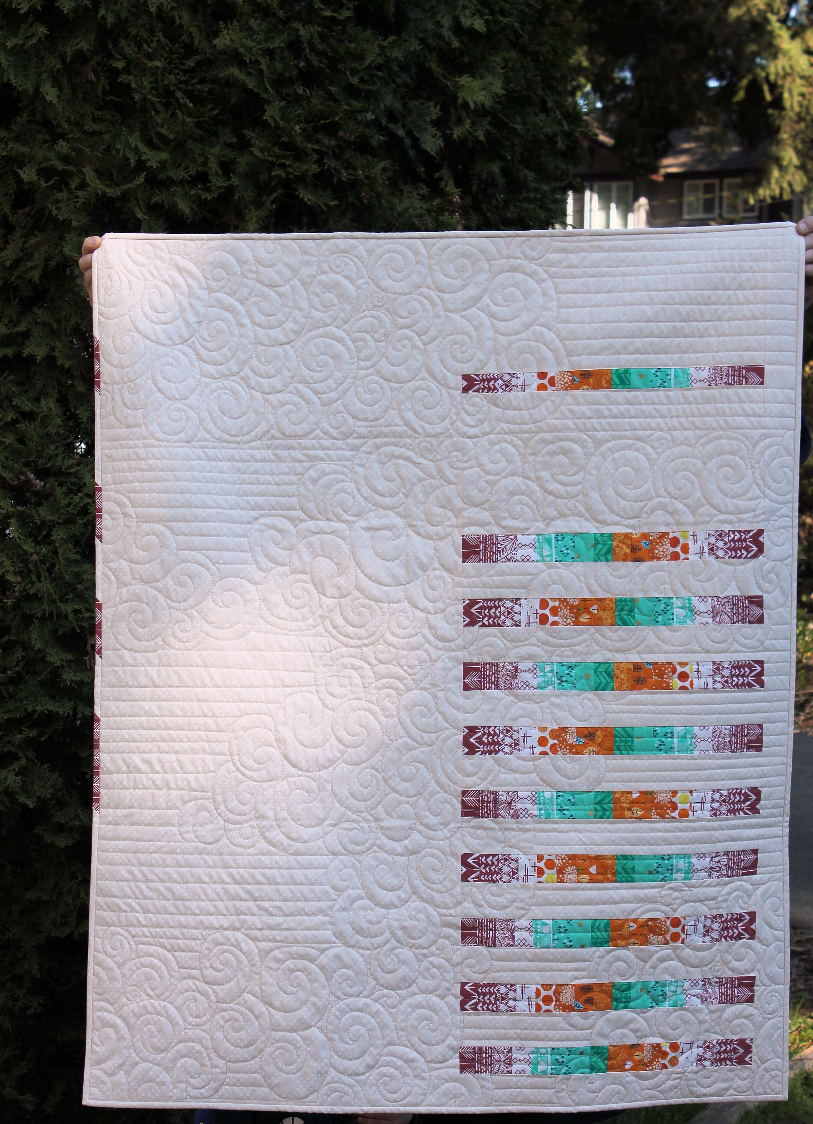 For the quilting, I took a chance on a variation of a design I saw on 13 Spools. Amy Garro has some great tutorials for quilting, and my favorite is her Matchstick feathers. I am not quite at feather level on the long arm, so I thought I would do some freemotion large swirls, in part to contrast with the pieced bars, and in part to start getting used to the control it takes to really reign the curves in. As I went, I decided to add some horizontal spaced lines to compliment my spaced bars and add the contrast to the swirls. It isn’t matchstick, but the effect is what I wanted,and the result looks like a cloudy sky with the wind blowing between them. The almost Oriental color theme, the back and forth of the colors, and the quilting stuck the name Trade Winds in my head. I think it really suits. I used Aurifil 40wt in Sand for the quilting, and the darker thread did wonders for the quilting!