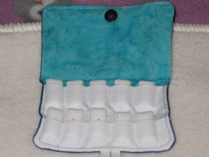 Sew your button to the center of the “flap”. The elastic should stretch over the button to keep the Gum Packet closed.