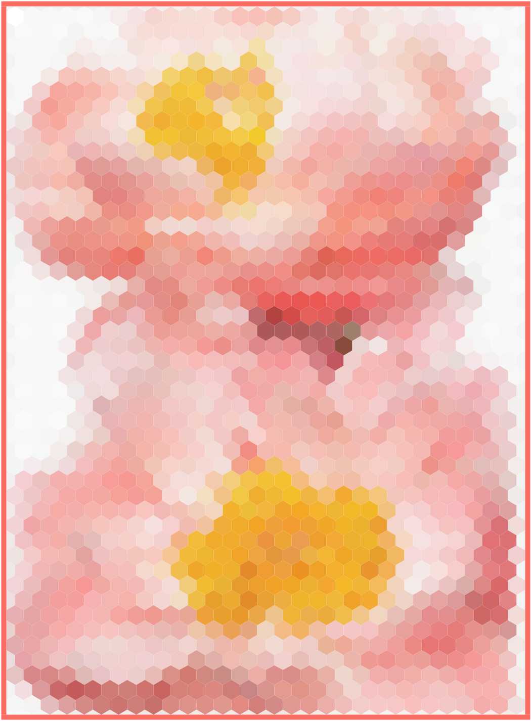 Take the medium bright yellow and bright yellow-orange 2”x 3 1/2” rectangles and sew them right sides together. Press the seams open to make the center squares.Take the medium tangerine 2”x 3 1/2” rectangles and sew them to either side of the center squares as shown. Press towards the center square. Take the light blue 2”x 6 1/2” rectangles and sew them to the top and bottom of the block. Press towards the center square.