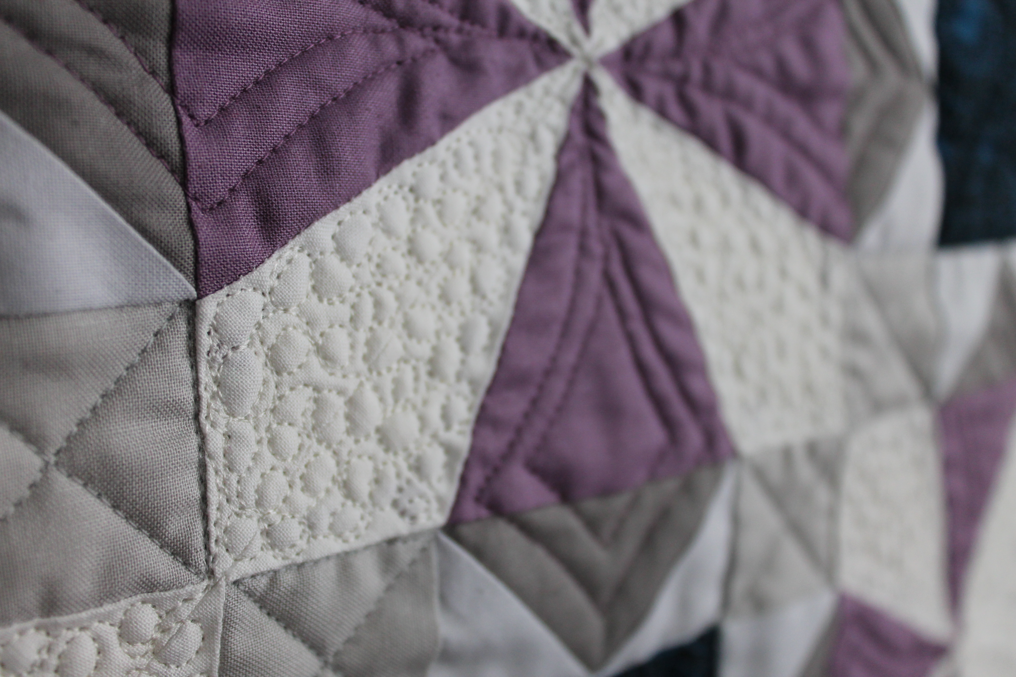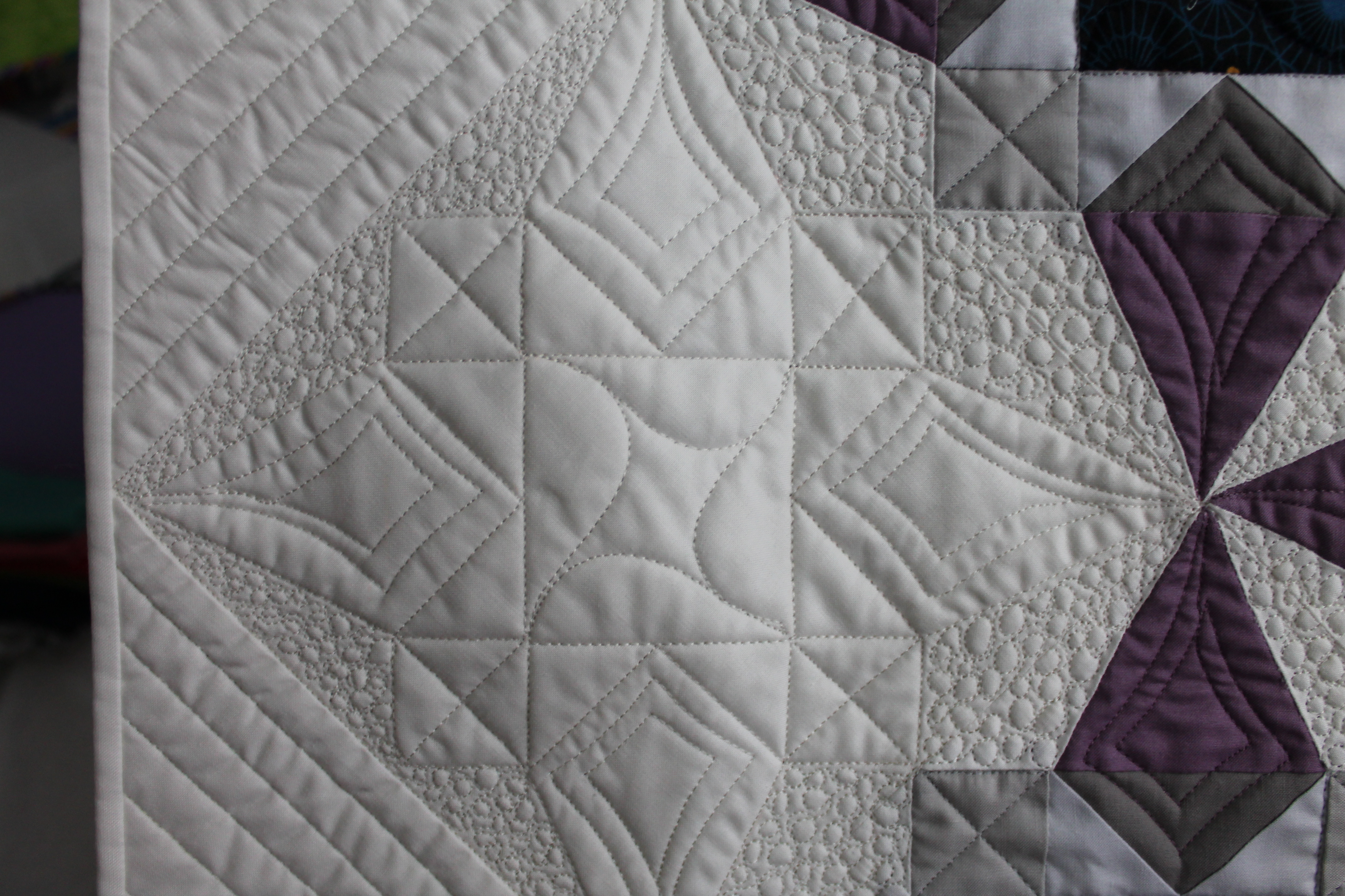 You could quilt each color individually, changing threads each time, to hide the quilting and let the blocks pop. Alternately, you could choose a medium blue thread and quilt in straight lines that radiate out at angles from the center of the block to mimic the flow of light, and then use a swirl in the yellow sections to soften out all the hard angles.