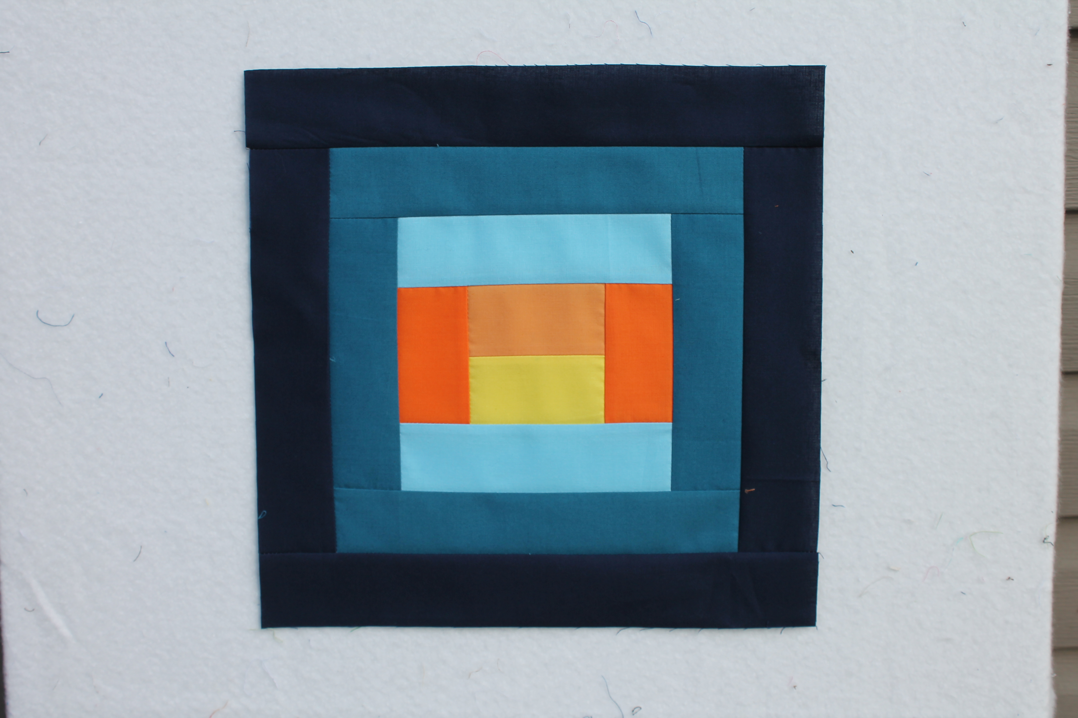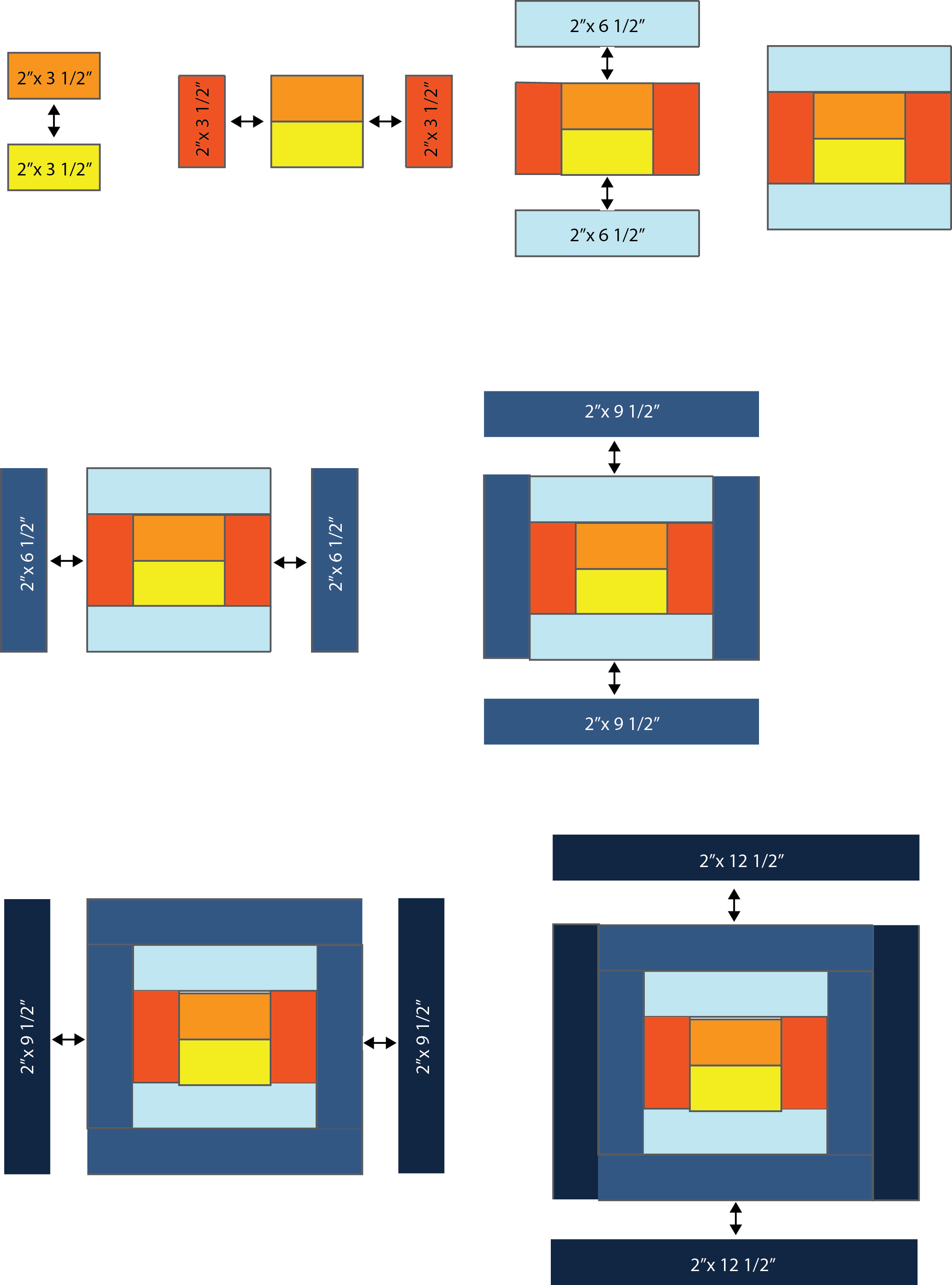 Take the medium blue 2”x 6 1/2” rectangles and sew them to the sides of the block as shown. Press towards the center, and then sew the medium blue 2”x 9 1/2” rectangles to the top and bottom. Press towards the center.