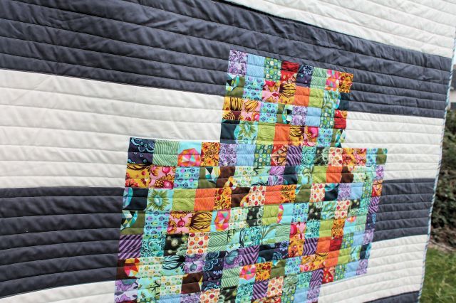 I quilted in straight lines and used my two favorite Freespirit solids – Mist and Manatee – for the background stripes. This quilt lives on my couch and adds the perfect splash of color to my space.