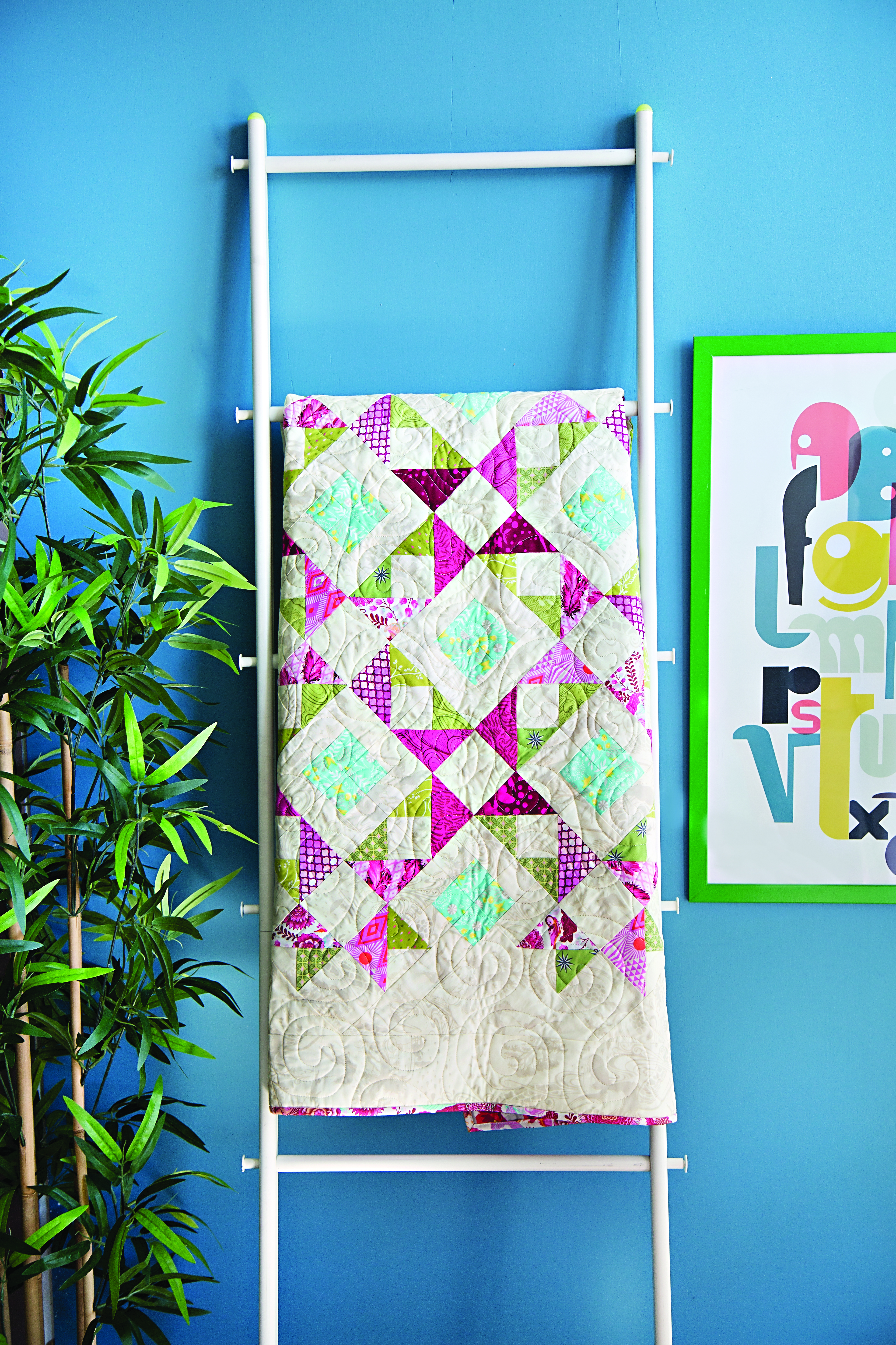 The January 2020 featured a quilt I made using the Tula Pink collection Monkey Wrench. It was a super fun and bright collection that featured monkeys, cockatiels, and frogs (FROGS!!!!) Monkey’s Lunch is super quick and easy to put together. The photographer to AQ Magazine went on a roadtrip for this shot, and I love it!
