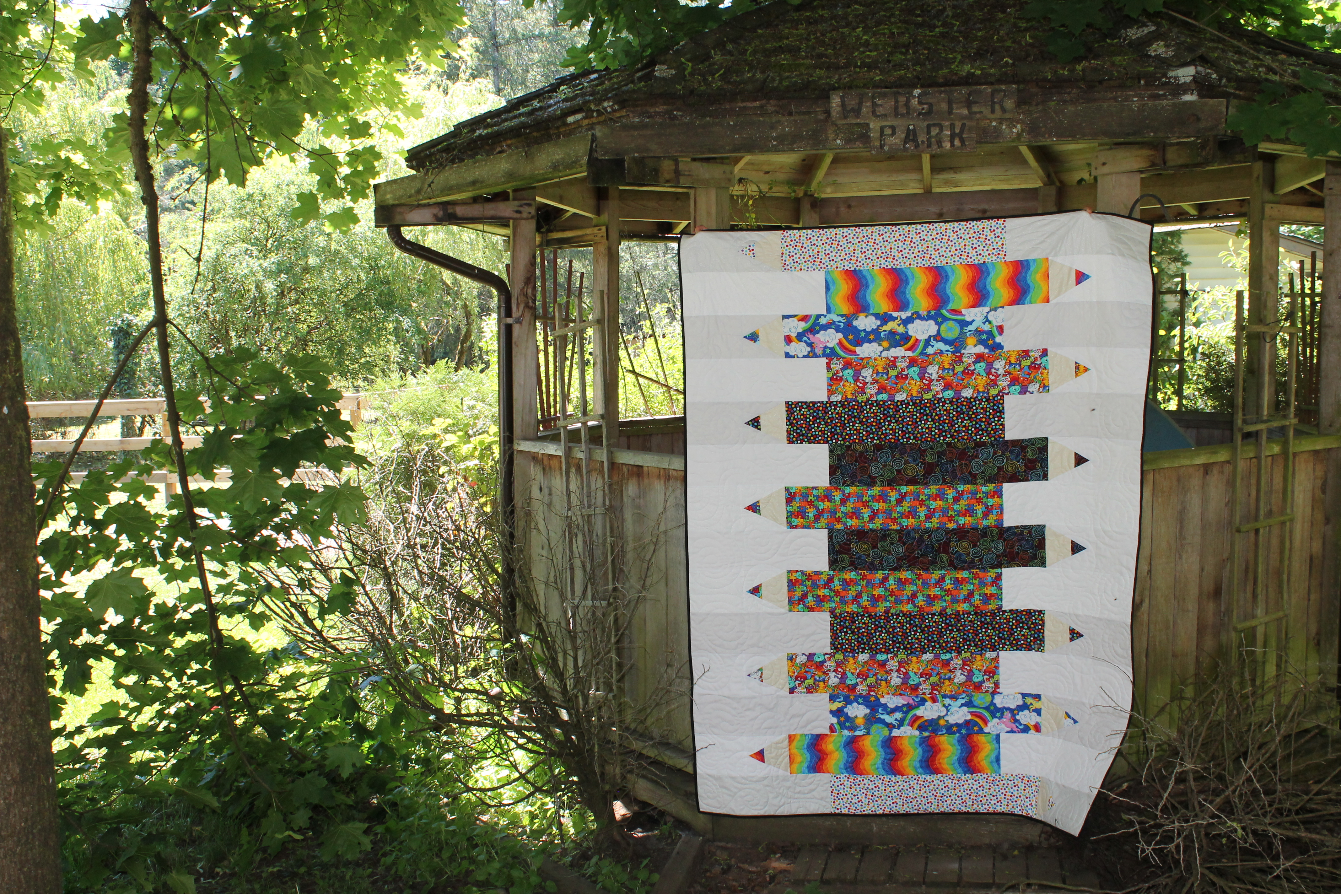 In my mind, this quilt represents light in all it’s full prismatic glory, gently bathing the world in color as it rains from the stars.