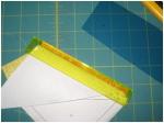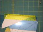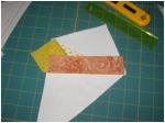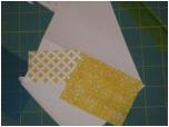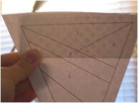 Take your 4 Templates without Corners and place strip #1 Right Side Up on the unprinted side of the template. Use the light trick to make sure the entire section is covered. Baste the strip in place on the dotted cutting line or in the extra paper outside the template. This will hold your fabric in place. Place your straight edge along the sewing line, turn the paper back, and trim the seam allowance. (It is the same line as shown above)