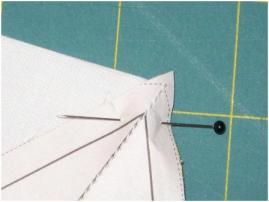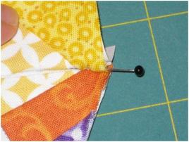 Place a no-corner wedge RST on top of a with-corner wedge. Pin together at the top and bottom by placing a pin through the points at the top (black) and bottom (white) so it is loose, as shown. Line up the seam allowances. Hold the bottom firmly so the pieces don’t move and secure by pinning normally.