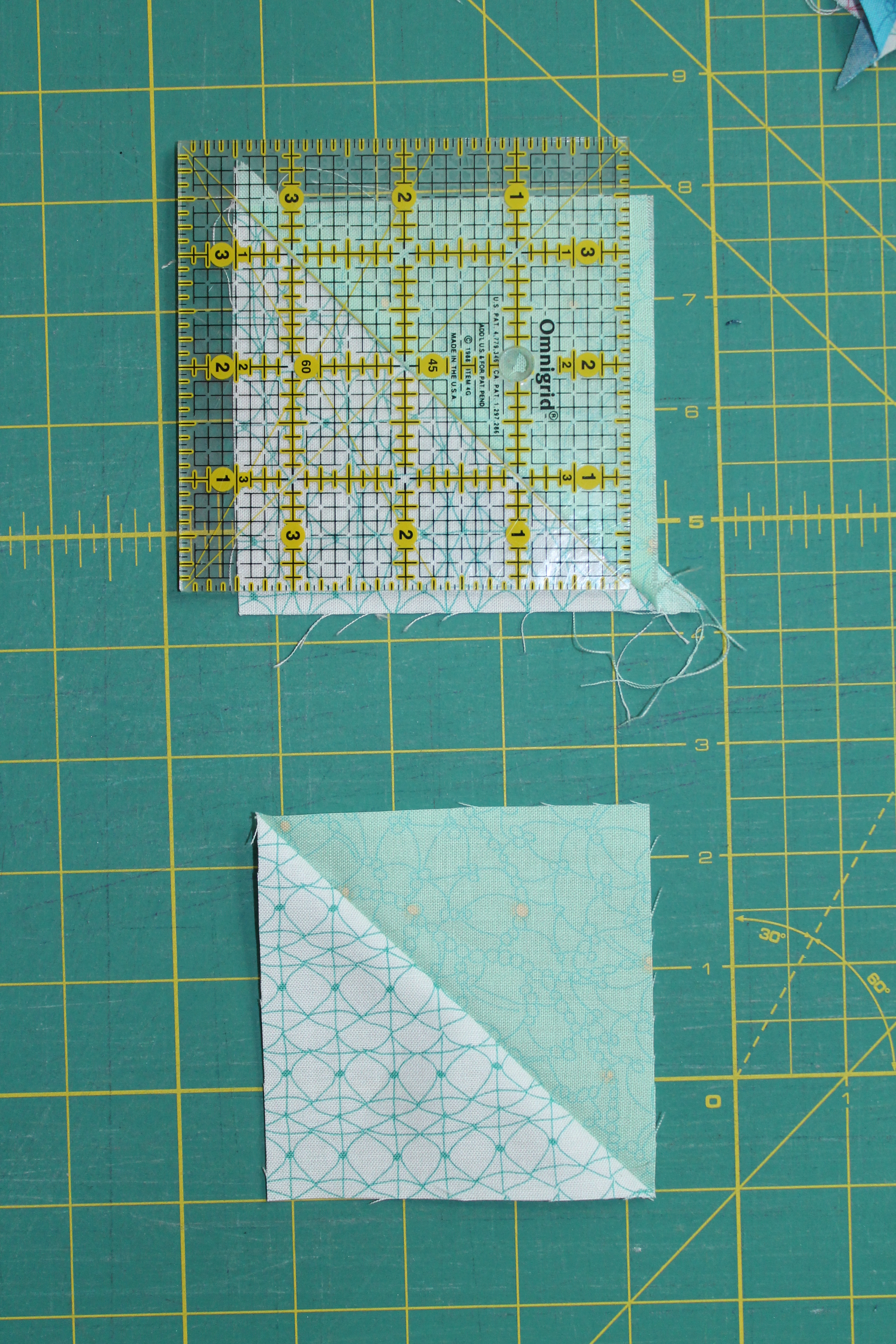 1. Sew the print HST’s right sides together with the background HST’s to make 16 HST squares. Press and trim the squares to 3 1/2″.